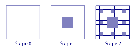 à l'étape 1 on enlève des carrés de taille $\left(\dfrac 1 3\right)^2$, et ainsi de suite.